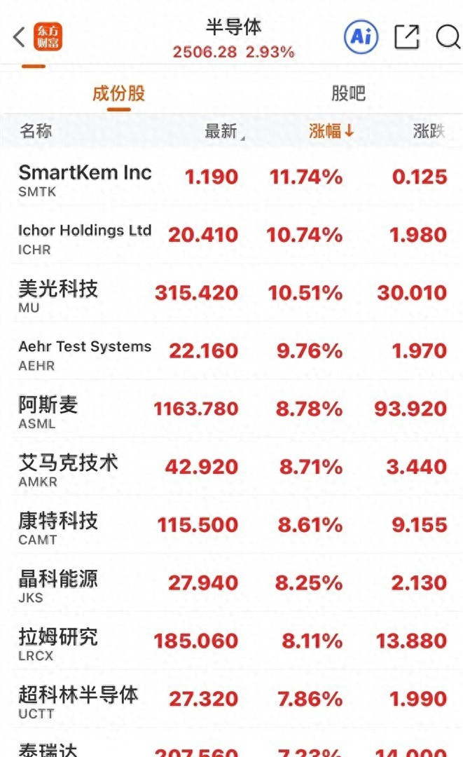半导体设备股表现尤为突出,阿斯麦、拉姆研究等涨幅均超8%。 设备股的强势反映了市场对全球芯片产能扩张的预期,台积电、英特尔等巨头的资本开支计划支撑了设备商业绩展望。