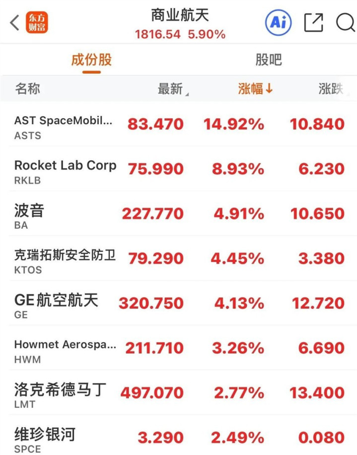 商业航天板块同样表现抢眼,板块整体涨幅达5.90%。 AST SpaceMobile股价跳空高开,收盘大涨14.92%,Rocket Lab上涨8.93%,波音涨4.91%。 该板块的活跃与美国航天局近期释放的价值超20亿美元的商业合作计划直接相关,同时SpaceX的IPO进程加速也提振了市场情绪。