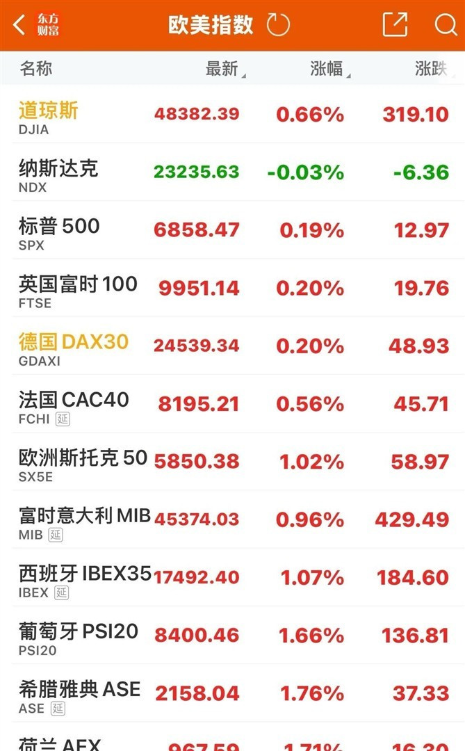 欧洲三大股指全线上涨,但涨幅相对温和。 英国富时指数上涨0.20%,德国DAX指数上涨0.20%,法国CAC指数上涨0.56%。 欧洲市场的稳健表现与美股的结构性狂欢形成对比。